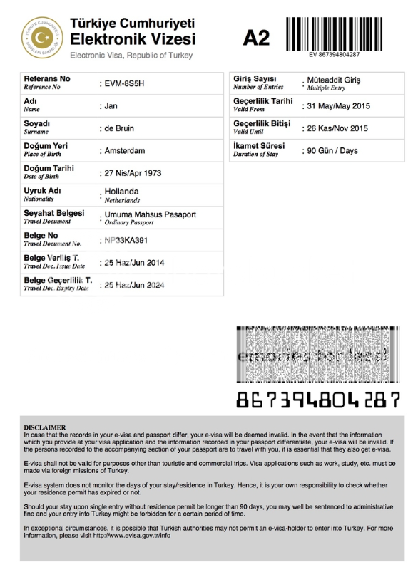 Unten sehen Sie, wie das Türkei E-Visum aussieht, wenn Sie es von uns erhalten. Wir haben unter dem von der türkischen Regierung beantragten Visum beschrieben, was Sie auf dem Visum sehen.